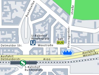 The Prinzregent hotel is located in the center of Berlin, just 2 minutes away from the subway station Bundesplatz.