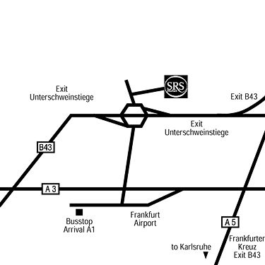Distances City center with restaurants, cafes and bars – 10 kilometers (6 miles) Shopping districts - 10 kilometers (6 miles) Museums and art galleries – 10 kilometers (6 miles) Fairground – 10 kilometers (6 miles) Highway A3/A5 – 1 kilometer (0,6 miles) Main Station – 10 kilometers (6 miles) Next Train Station (Airport) – 1,8 kilometers (1 mile) Goethe’s birth place – 10 kilometers (6 miles) St. Paul’s Church – 10 kilometers (6 miles) Wiesbaden – 30 kilometers (18 miles) Heidelberg – 80 kilometers (49 miles) International Airport Frankfurt (FRA) - 900 meters (0,56 miles) Directions By car: A3 from Würzburg Exit Flughafen B43 Kelsterbach 1. Exit Unterschweinstiege/Schwanheim A3 from Cologne Exit Flughafen, Direction Frankfurter Kreuz B43 3. Exit: Unterschweinstiege/Schwanheim A5 from Basel Exit Flughafen, Frankfurter Kreuz B43 1. Exit: Unterschweinstiege A5 from Gießen/Kassel Exit: Flughafen B43 1. Exit: Unterschweinstiege / Schwanheim |